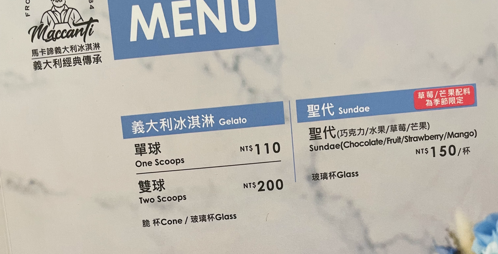 The price is NTD$110 for 1 scoop and NTD$200 for 2 scoops, you can choose to have it served in a chilled glass bowl or cone. If you are buying it for take-out, then it's a paper cup or a cone. The cone is free and they would still give you a chilled glass bowl to stick the cone in to prevent a melty mess. It's not exactly cheap but I found it to be worth the price on the occasional cheat day and meeting friends for a chat. They also have other drinks, food, and dessert on their menu, including souflé pancakes with boba. I saw someone order boba milk tea, too. But I came for the gelato so I didn't pay much attention to the other stuff.